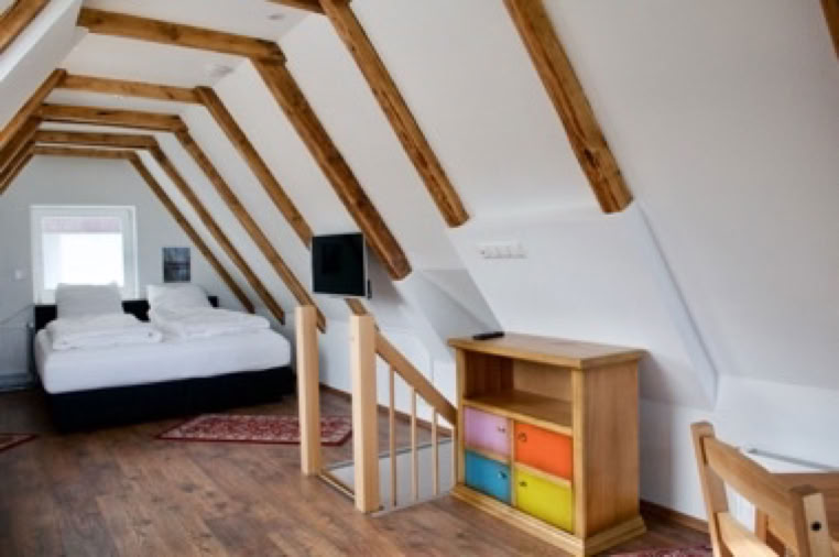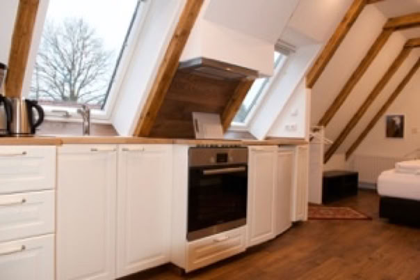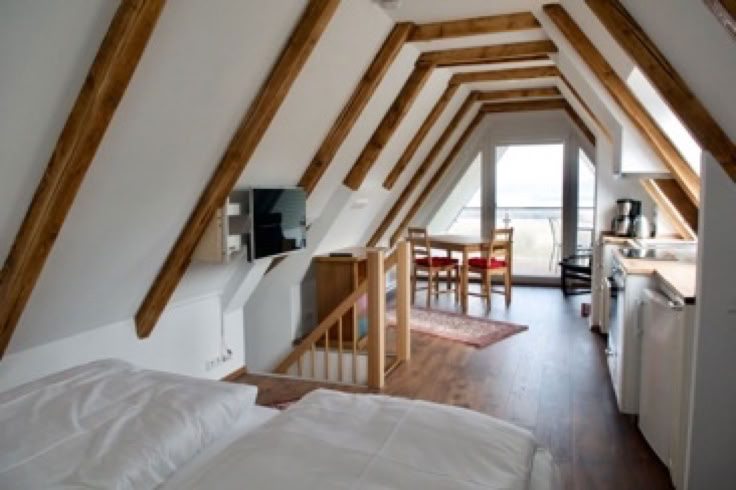 Gemütliche Studio-Wohnung mit Wohn-Essbereich, Tisch mit 2 Stühlen, Lese-Sessel, Kommode.