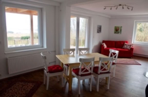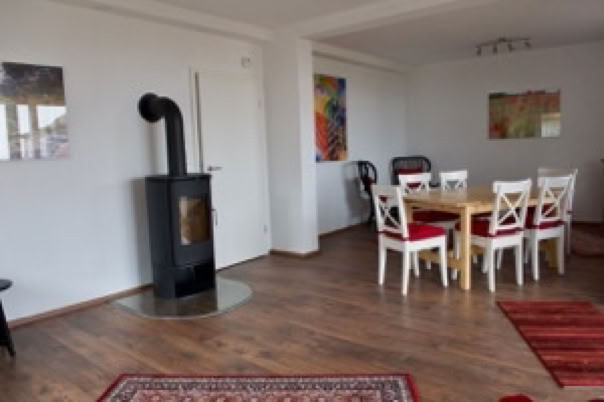 Großes Wohnzimmer mit Kaminofen, gemütliche Sitzecke, Tisch mit 6 Stühlen, Kommode, Flachbild-TV.