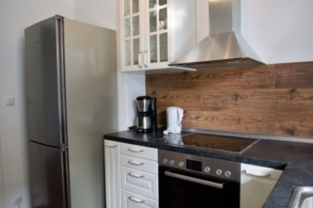 Komplett eigerichtete Einbauküche. Herd, Backofen, Dunstabzug, Spülmaschine, Kühl-Gefrierkombination, Mikrowelle, Kaffeemaschine.